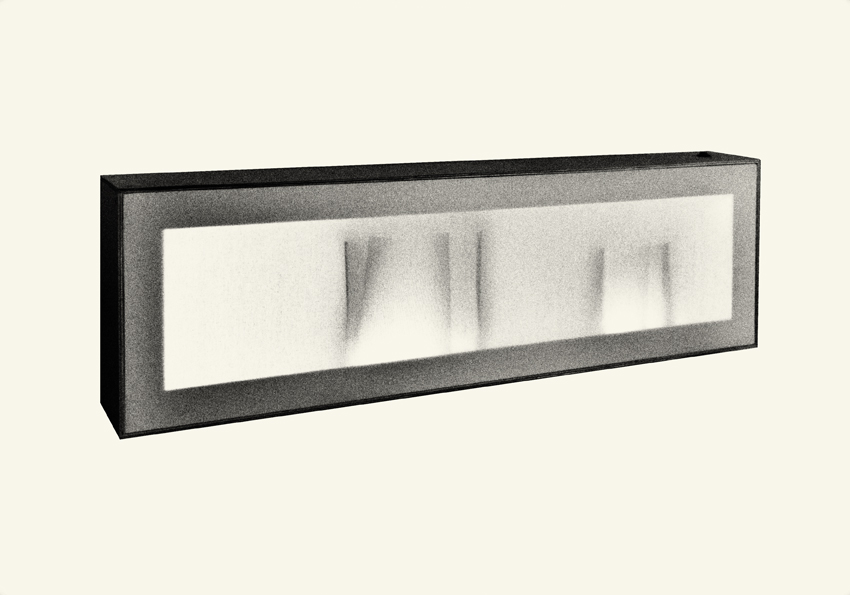 Kompozycja bibliosferyczna, 20 x 100 x 15 cm, light box, drewno, płótno, lektury obowiązkowe, 2018.